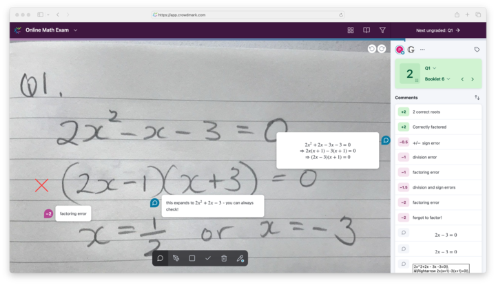 Crowdmark is a grading and assessment solution that enables educators to grade paper-based and digital exams and assignments 3X faster than traditional workflows. Instructors and grading teams can give richer, more formative feedback directly on student answers. This supports students' understanding of errors while reducing regrade requests.